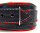 Ошейник с красным подкладом. Выполнен из толстой ременной кожи черного цвета, подклад мягкая перчаточная кожа ярко красного цвета. На пряжке. Использована усиленная металлическая фурнитура. Строчка толстой ниткой контрастного красного цвета.