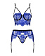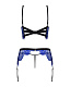 Комплект белья из серии Cobaltess из кружева с ресничками и тонких бретелей: полукорсаж на косточках, тонкие бретельки регулируются по длине, на спине застежка-удлинитель. Пояс с застежкой-удлинителем на спине, пажи для чулок регулируются по длине. Кружевные трусики-стринг. В комплекте: корсаж, трусики, пояс для чулок.