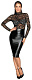 Платье до колен с длинными рукавами, в обтяжку, строгий крой в черном элегантном сочетании мягкого кружева (верх) и матового блестящего материала wet-look (часть юбки). Небольшой воротник-стойка, застегивающийся на 2 пуговицы сзади. Небольшой разрез на подоле сзади.