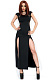 Сексуальное вечернее платье, верх платья сложного кроя, из двух тканей компаньонов: эластичного гипюра с цветочным орнаментом и микрофибры. Длинная, слегка расклешённая юбка, снабжена двумя глубокими вырезами, открывающими ноги. Комплектуется стрингами. В комплекте: платье, трусики-стринги.