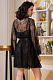Короткое запашное кимоно с длинным рукавом выполнено из французского кружевного полотна с нашитыми пайетками в цвет кружева. Фестон кружева расположен по краям бортов, низу рукавов и низу изделия. Линия талии подчеркнута широким атласным поясом, концы которого декорированы кружевом.
