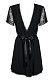 Небольшая длина, подчеркивающая красоту ног, строгий черный цвет, отсутствие воротничка, длинный пояс из атласной ленточки, кружевная оторочка, рукавчики из ажурного полотна – ням-ням! Трусики-стринги в комплекте. В комплекте: пеньюар, трусики-стринги.