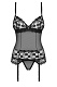 Элегантный корсаж, изготовленный из прозрачной вуали и узорчатого кружева. Чашечки корсажа на косточках с тонким поролоном снизу визуально делают грудь пышнее. Декоративный бантик и сверкающая подвеска привлекают внимание к зоне декольте. Бретели регулируются по длине. Низ корсажа также выполнен из кружева. Пажи позволяют дополнить корсаж чулочками. В комплекте: корсаж и трусики-стринги.