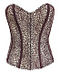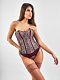 Сексуальный корсет из флокированной сетки. Рельефный крой деталей и вертикальные косточки по всей окружности подчеркивают линию талии, придавая фигуре форму песочных часов. Фронтальная часть изделия выполнена из сетки с флокированным флористическим орнаментом, с вертикальной застежкой на крючках. Задняя панель - из полупрозрачной сетки, с декоративной шнуровкой атласной лентой. Без бретелей.