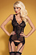 Треугольные чашечки лифа по краю отделаны ажуром и вместе формируют глубокое и соблазнительное декольте. Во всю спинку тянется шнуровка, гарантирующая плотное облегание. В комплекте трусики-стринги с кружевами и всё тем же цветочным узором. В комплекте: корсет, трусики-стринги.