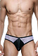 Мужские слипы с низкой посадкой, у которых задняя поверхность и боковые вставки сшиты из крупной сетки, гульфик из непрозрачной тянущейся ткани. Черным кантом обшита вся поверхность трусов.