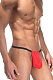 Эротические трусы на тонких черных резинках, с ярко-красным гульфиком-мешочком. Ягодицы полностью открыты.