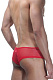 Трусы-хипсы мужские с низкой посадкой. Сшиты из красной полупрозрачной хорошо-тянущейся ткани, спереди вставка из золотой ткани.