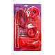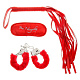 Набор красных аксессуаров для влюблённых: плетка, наручники с опушкой, повязка на глаза.