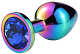 Разноцветная гладкая анальная пробка с синим кристаллом - 9,5 см.